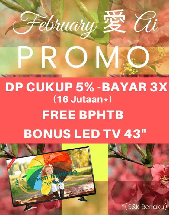 Green Bamboo Terrace February AI Promo adalah februari berbagi cinta dengan memberikan Promo kemudahan cara bayar melalui cara bayar KPR dengan Down Payment cukup 5%, dan dapat dicicil 3x bayar. Tak cukup sampai disitu, untuk promo Februari Ai ini Green Bamboo Terrace juga memberikan Free BPHTB untuk cara bayar KPR.